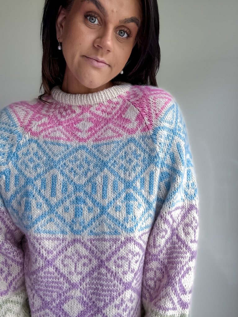 Drama Queen Sweater er en oversized mønstergenser strikket nedenfra og opp med raglanfelling og er monteringsfri. Genseren er designet for 10–30 cm bevegelsesvidde, velg størrelsen der ferdig overvidde er 10–30 cm større enn ditt brystmål, avhengig av ønsket oversized-følelse. Modellen er lang; ønskes kortere, reduser diagrammene i høyden<3