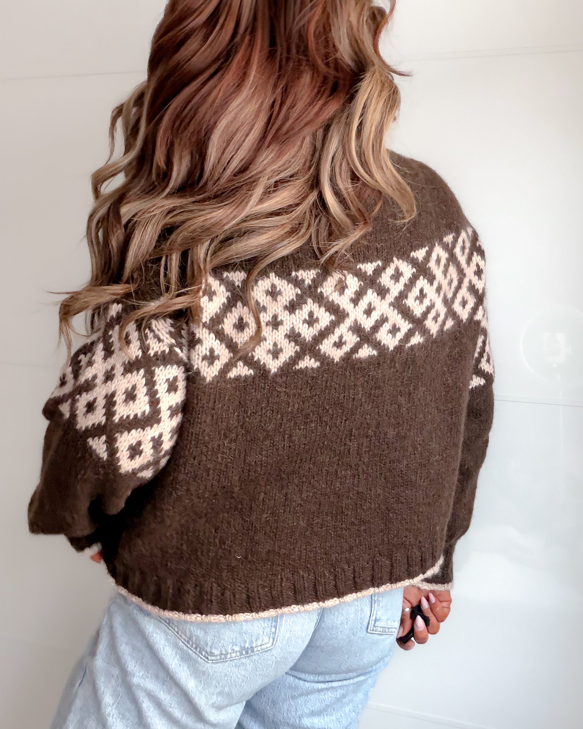 Genseren på bildene er strikket i Legacy + It's Giving.