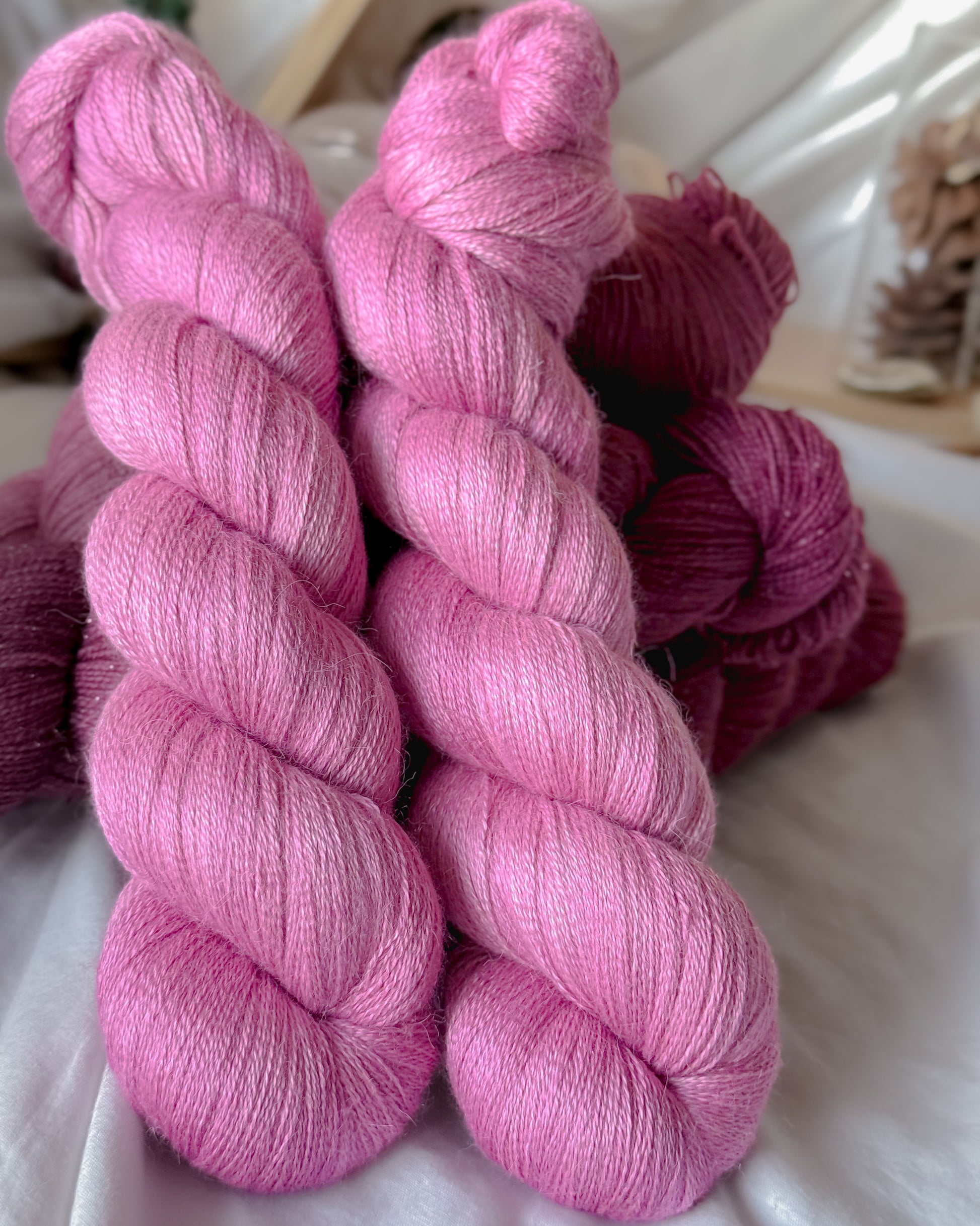 Garnet består av 50% Baby Suri Alpakka, 30% Fine Merino, 20% Silke.