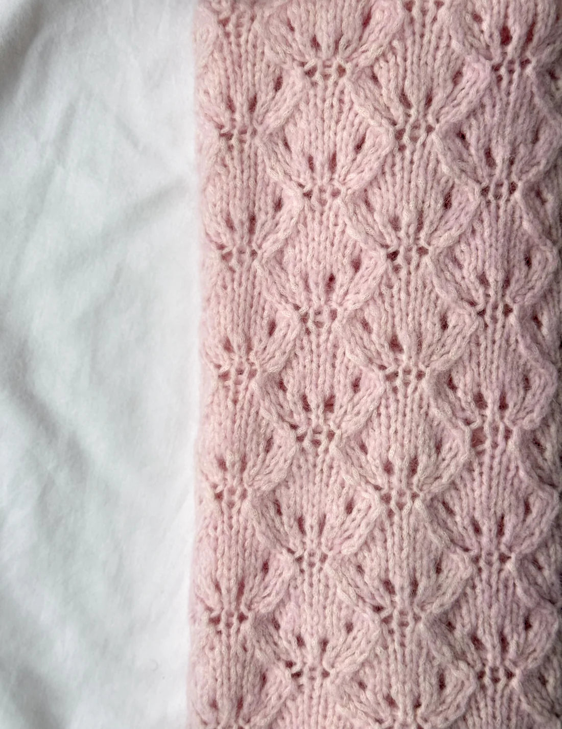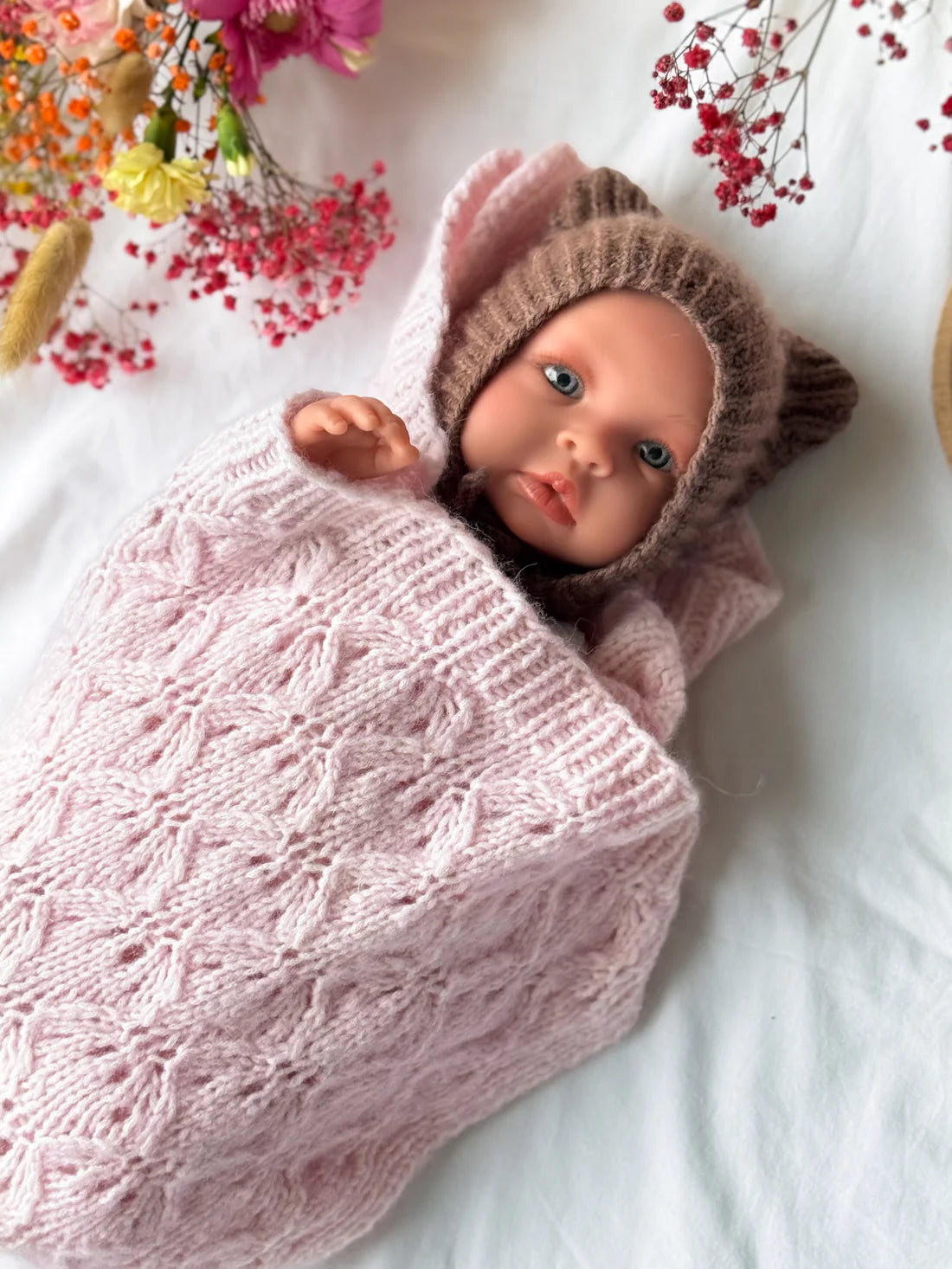 Inez Vognteppe er et tykkere teppe i blowyarn, som passer perfekt til vognen, i vuggen eller til å svøpe nyfødt i. Teppet strikkes frem og tilbake i strukturstrikk, med ribb rundt kantene.