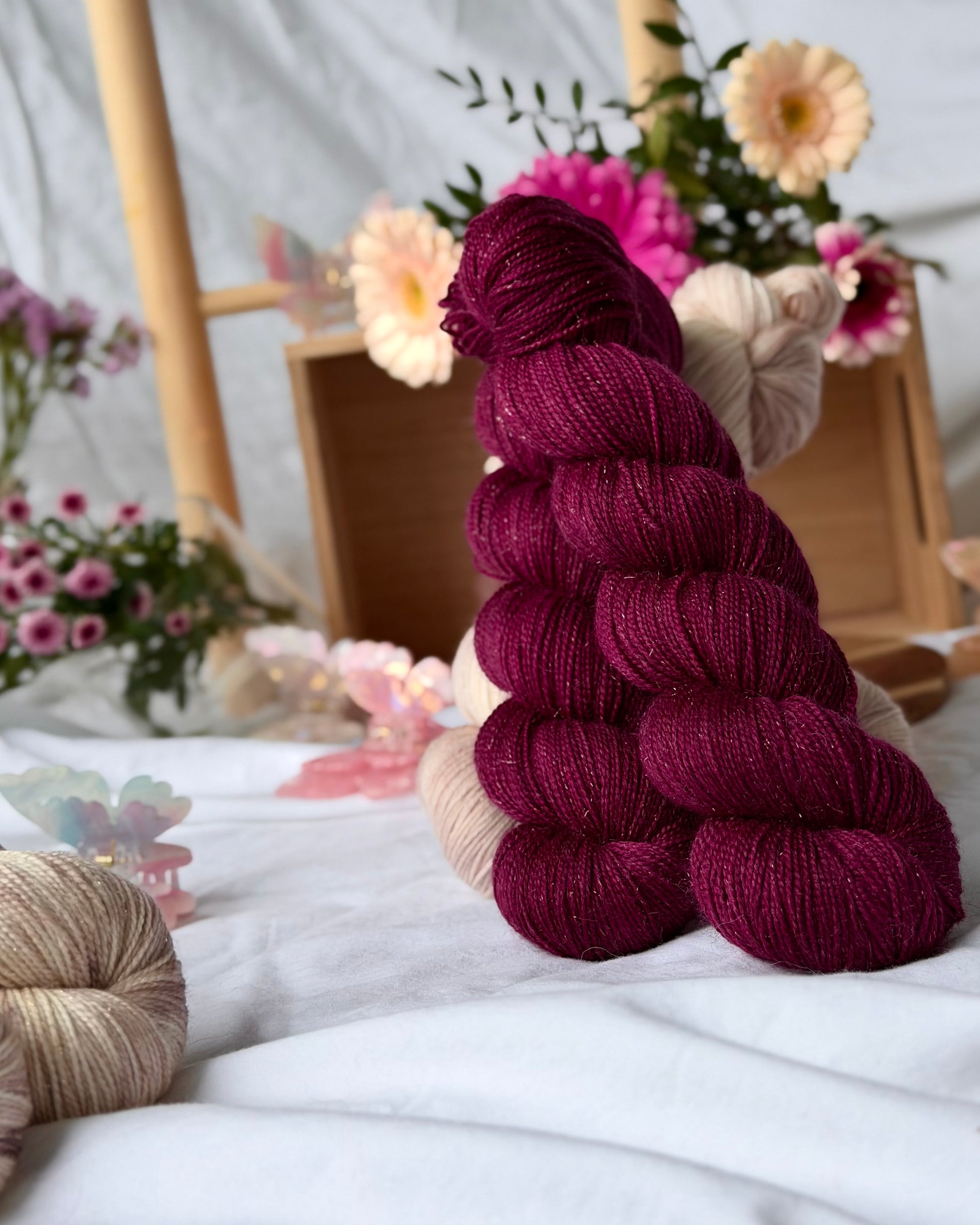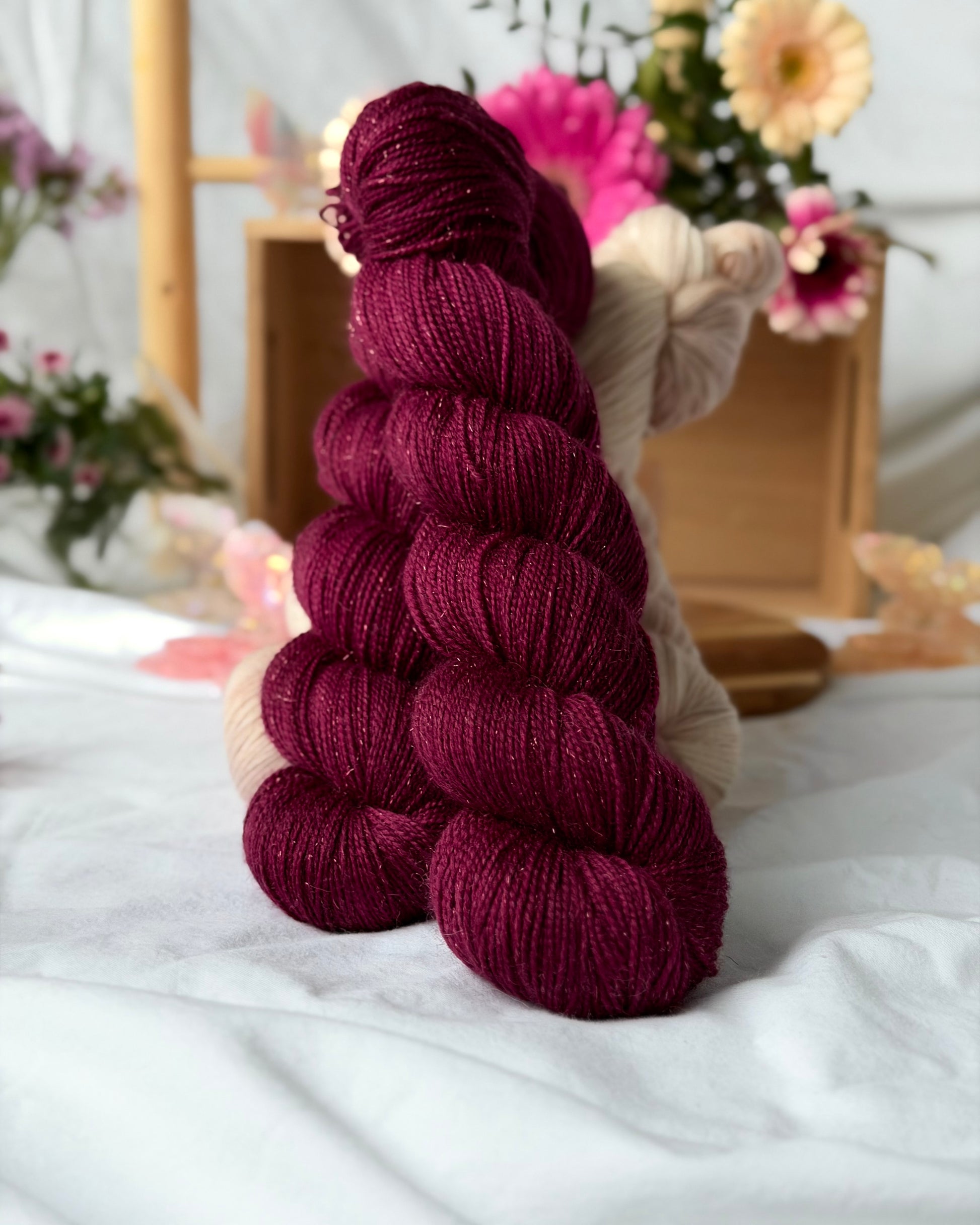 Garnet består av 75% Superwash Merino, 20% Nylon og 5% Stellina Gullglitter