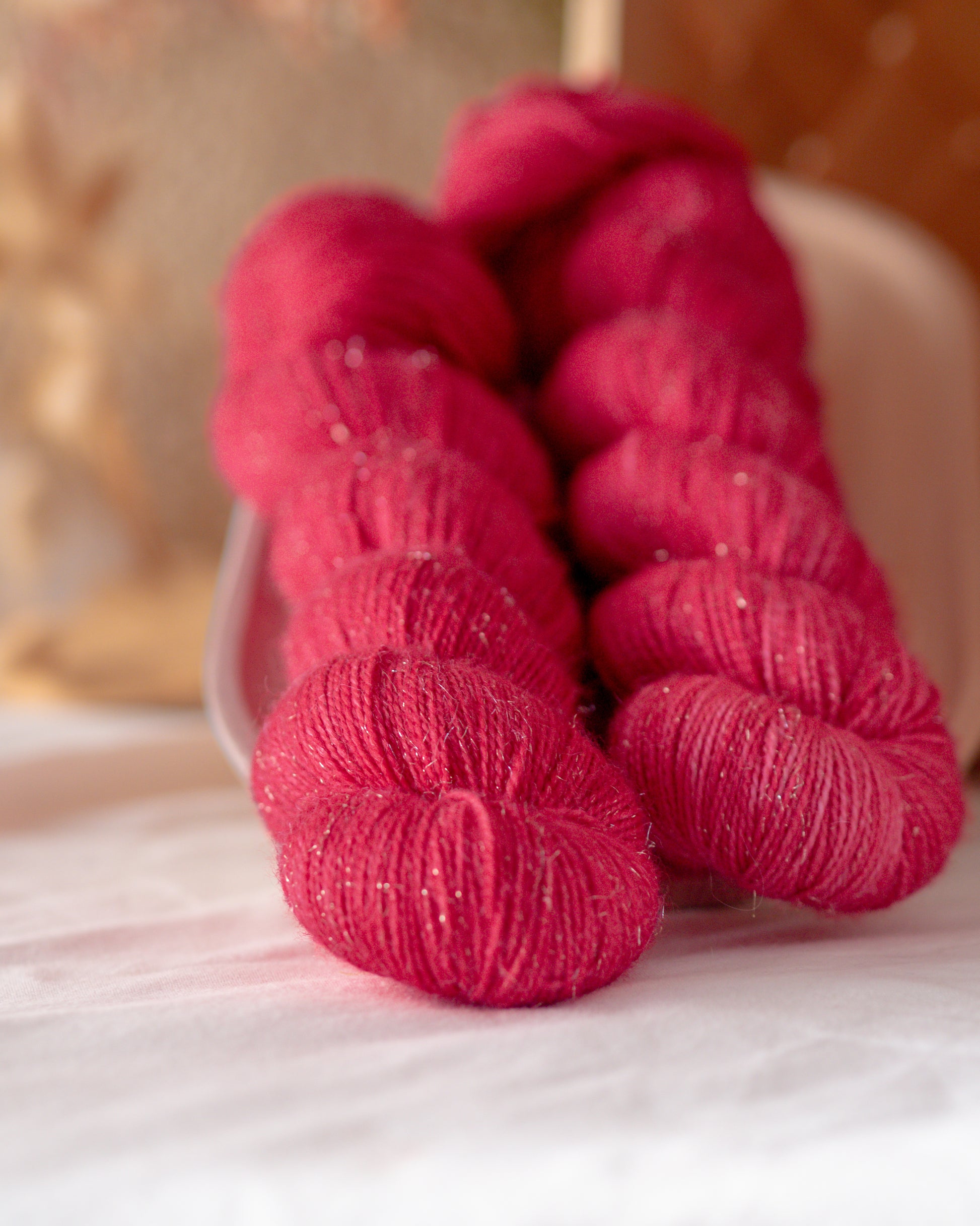 Tynn glittermerino med gold sparkle <3 Glitteret gir en superfin effekt, og garnet egner seg godt alene, i dobbel tråd eller sammen med Kid Silk Lace eller Suri Silk Følgetråd. Bejeweled er mykt nok til baby- og barnestrikk, artig i egostrikk og slitesterkt nok til sokkestrikk og vask i maskin.