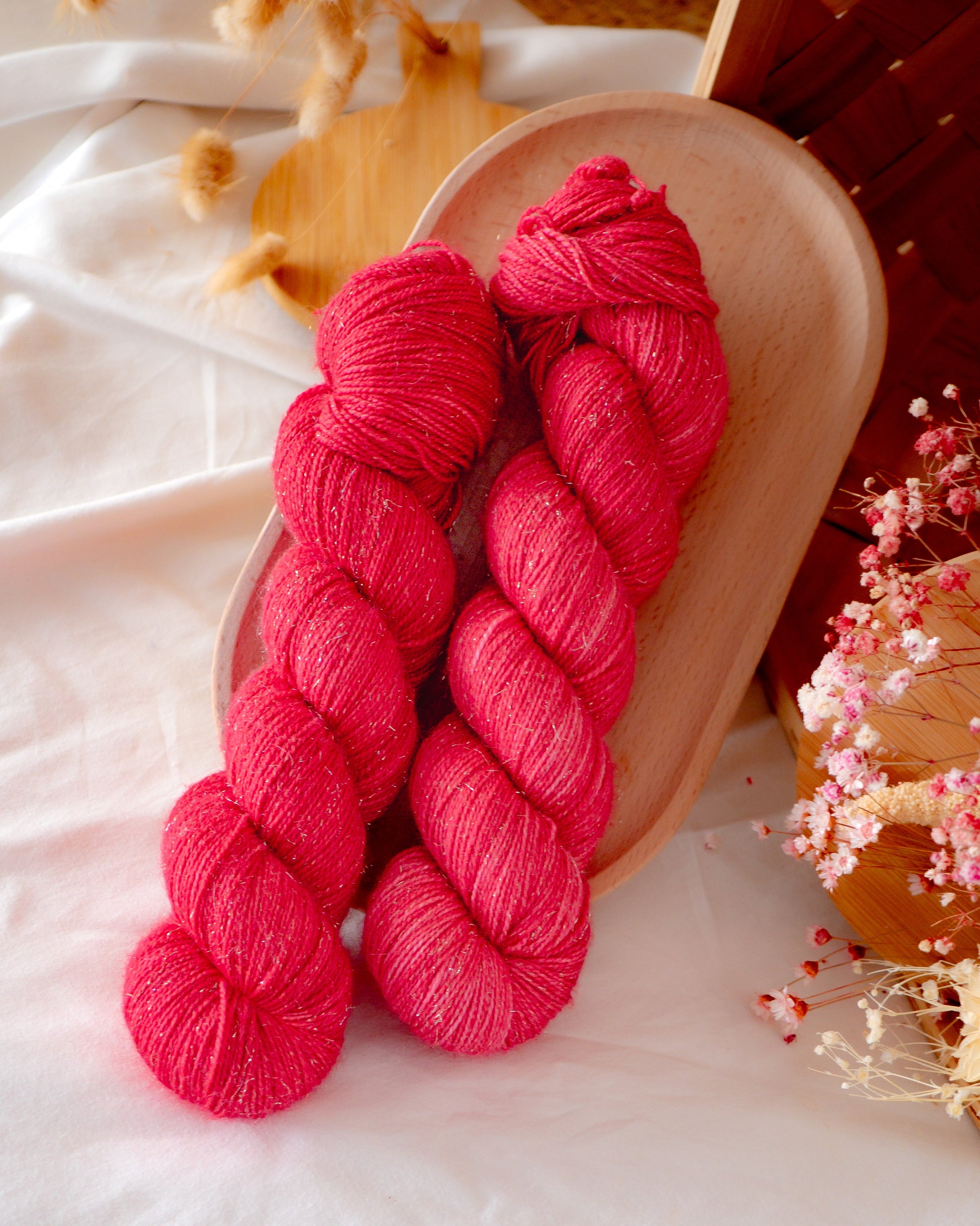 Garnet består av 75% Superwash Merino, 20% Nylon og 5% Stellina Gullglitter