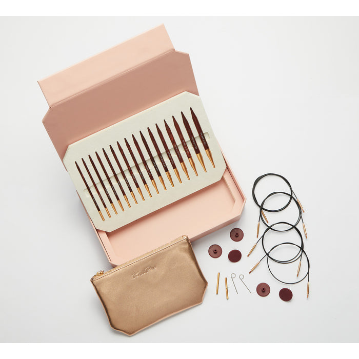 Symfonie Rose luksussett er en spesialutgave i mørklakkerte strikkepinner av bjørk. Disse utskiftbare strikkepinnene er fantastiske å strikke med og akkurat passe spisset slik at maskene glir lett på plass.